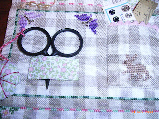 Por dentro, un bordado adaptado de un modelo de Couleur d'Etoile, una pieza de tela en el centro para clavar las agujas, un imperdible, un par de botones, y abajo un bolsillito para llevar hilos de varios colores y unas mini tijeras adornadas con un pom-pom, ¡vamos¡ lo básico por si hay una pequeña urgencia